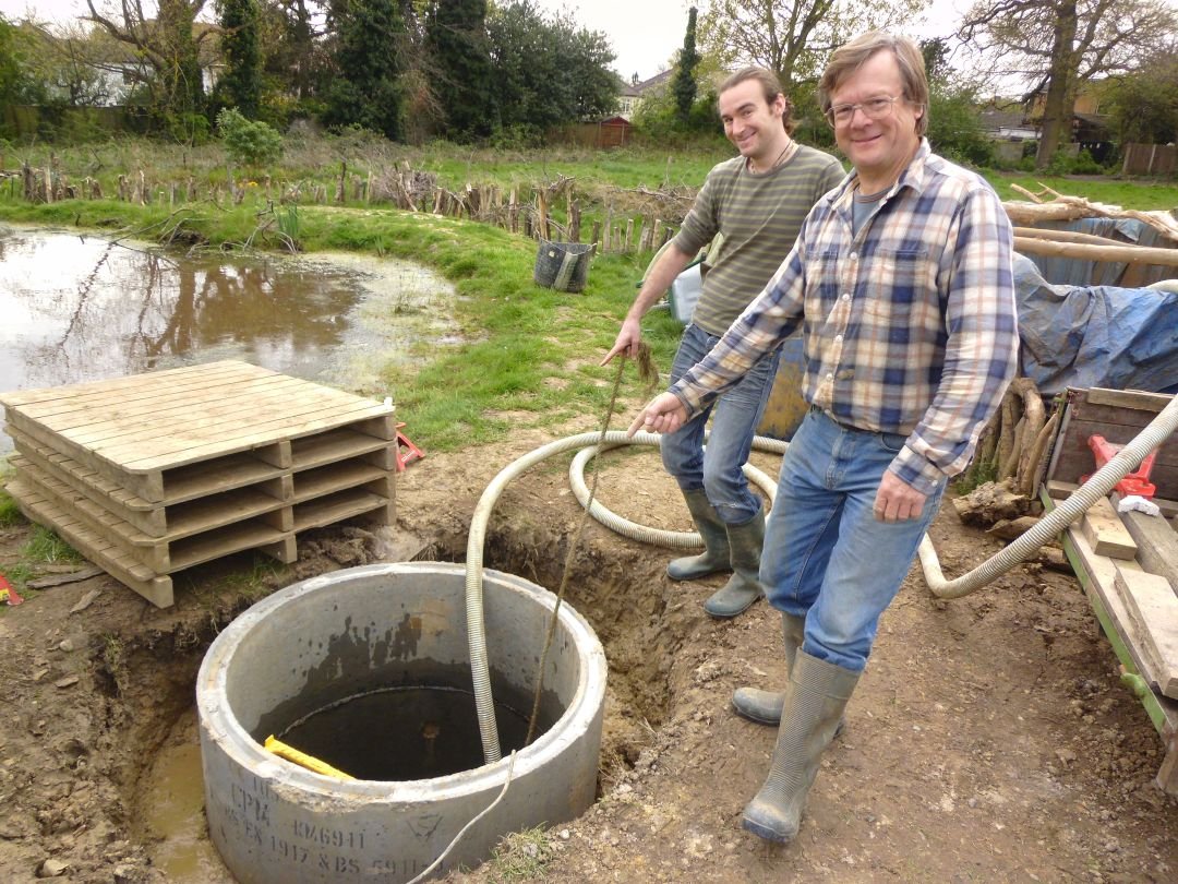 It's The Well! Pumping Out. The rain during the week filled the well up a bit so here Harrison and Bob are pumping it out before the Topping Out starts. |