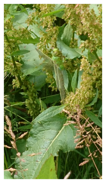 | These photographs show a newly emerged Emperor dragonfly Anax imperator – it has yet to gain its full colours. The British Dragonfly Society - www.british-dragonflies.org.uk has confirmed this. | |