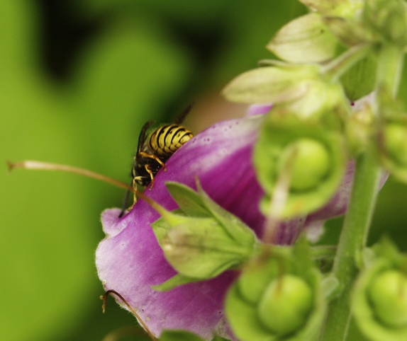 Worker bees guard the entrance of the nest to keep out intruders. Unlike wasps, bees can only sting once. This is because their stings are attached to their intestines. The stings are barbed and get caught in their victim. When the bee pulls away the sting is left in the victim still pumping its venom. This damages the bee and it subsequently dies. Like wasps, the bee's venom contains an alarm pheromone which stimulates other bees to attack.