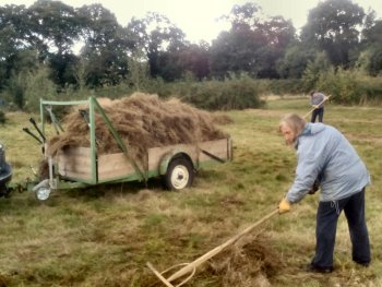 This year we cut the meadow grass rather late in the season with volunteers raking it all up for composting on 18th September. Click on image for larger photo.