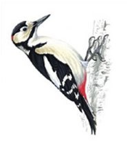The great spotted woodpecker is found anywhere where there are mature trees with suitable holes for nesting. It likes broad leaved trees but it can live on mature conifers. It will live in parks and gardens and will feed from bird tables and peanut feeders. It spends most of its time clinging to tree trunks and branches, and will try to hide on the other side of the tree when aware of being watched by humans. It can be seen all year round.